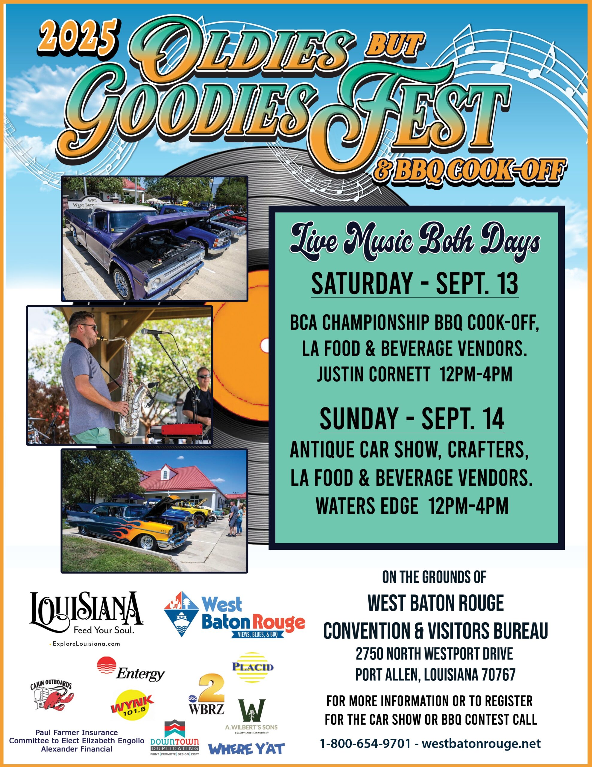 Live music on stage Sunday. Antique car show, hula hoop and jitterbug contests. This fun event is held on the grounds of the West Baton Rouge Tourist Information & Conference Center. Come and spend the weekend with us and enjoy great food, great fun and great music.